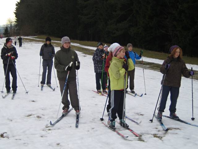 Co dělat, když dva dny před lyžařským kurzem roztaje téměř všechna zimní sněhová nadílka? Sníh najít! A my ho opravdu našli. Ve stínu na palouku u lesa a v bukovém háji pod observatoří Buchtův kopec. Lyžovat na ztvrdlé ledové ploše však nebylo vhodné pro sedmáky-začátečníky, a proto jsme jeden slunečný den podnikli cestu autobusem do Nového Města a pilovali lyžařskou techniku ve známém lyžařském areálu u Ski hotelu. Tam si teprve dvacet šest lyžařů i jejich vedoucí vychutnali ten pravý požitek na běžkách na vzorně upravené trati.