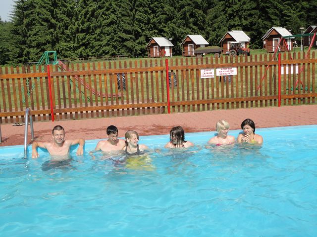 Na školní výlet do rekreačního střediska Tesla Vršov nedaleko Horního Bradla jsme se těšili už dlouho. Čekaly nás krásné 3 dny volna od středy 9. 6. do pátku 11. 6., které se nám vydařily přímo pohádkově. Tropické teploty po celou dobu pobytu přímo vybízely ke koupání v místním bazénu, kterého jsme si dosytosti užili a zároveň se krásně opálili při sportování - hráli jsme volejbal, nohejbal, fotbal, pinpong, dokonce jsme skákali i do písku. Vyřádili jsme se prostě úžasně. Před ukončením pobytu jsme neopomněli pochválit místní kuchyni, ve které velmi dobře po celou dobu vařili. Škoda jen, že to tak rychle uteklo. Byly to hezké chvíle před závěrem školního roku, na které budeme určitě vzpomínat.