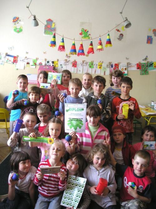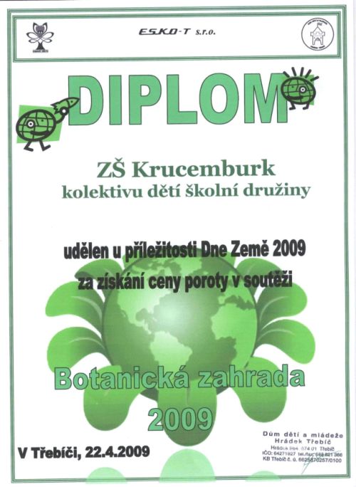 V Třebíči proběhlo u příležitosti Dne Země slavnostní vyhlášení výsledků 9. ročníku soutěže „Botanická zahrada 2009 & Přivoň si!“. Smyslem této akce je podpořit zájem žáků o odpovědné nakládání s odpady. Úkolem mladých výtvarníků bylo vytvořit z nejrůznějšího odpadu model rostliny. Do soutěže bylo přihlášeno 80 modelů. Na jejich tvorbě se podílelo přibližně 450 dětí z různých míst kraje Vysočina. Naši školu v této soutěži reprezentovala dvě dílka. Šikovní šesťáci se pochlubili květinami z tenkých papírových ruliček vyrobených z telefonních seznamů a žáci školní družiny vytvořili macešku, složenou z 1575 kusů víček od PET lahví. Třebíčskou porotu nejvíce zaujala právě tato mozaika.