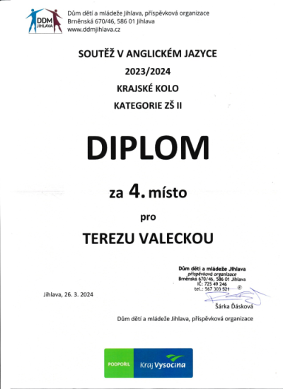 26. března 2024 se uskutečnilo krajské kolo Soutěže v anglickém jazyce. Okres Havlíčkův Brod reprezentovala naše žákyně Tereza Valecká. V kategorii ZŠ II se umístila na krásném 4. místě. Tereza musela předvést svoje vynikající znalosti při poslechu, porozumění textu, popisu obrázku a konverzaci. Tereze gratuluji a přeji hodně úspěchů při studiu anglického jazyka.