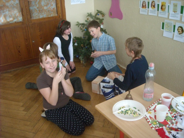 Žáci 4. třídy se opět domluvili, že si připraví divadelní vystoupení. Protože je vánoční čas, jedna skupina si připravila pěknou scénku o průběhu štědrovečerní večeře, příchodu ke stromečku, zpívání koled a rozdávání dárků. Nechyběl ani bohatě prostřený štědrovečerní stůl a dárky. Druhá skupina si připravila scénku o posledním dni ve škole před vánočními svátky. I oni byli velmi úspěšní. Chválím obě skupiny.