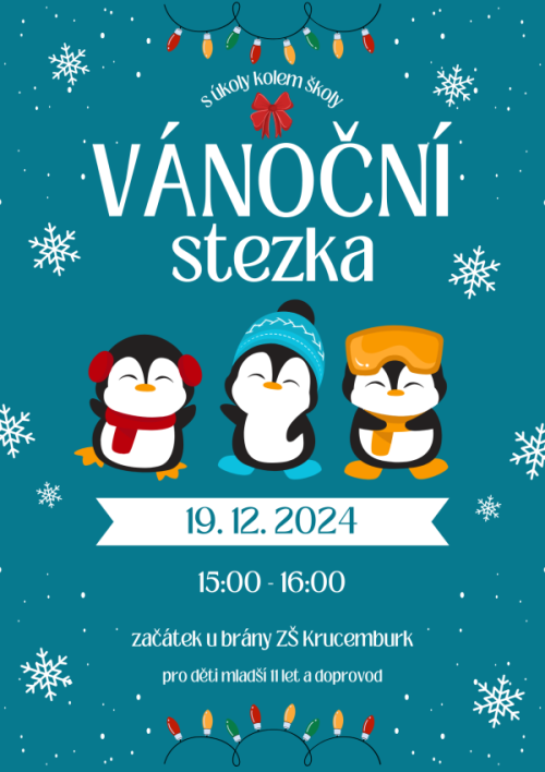 Ve čtvrtek 19. prosince se od 15:00 h do 16:00 h uskuteční Vánoční stezka s úkoly (pro děti mladší 11 let a doprovod), kterou si připravili žáci 2. stupně...