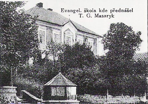 O prázdninách r. 1906 od 12. července do 15. září bydlel v budově evangelické školy profesor T. G. Masaryk se svou rodinou. Ve dne vyřizoval jako redaktor „Naší doby" došlé poštovní zásilky. Po svačině chodívala celá rodina na vycházku do okolí. V neděli pan profesor přednášel v některém okolním městě. Večer před odjezdem uspořádal pan profesor přednášku pro místní obyvatele. Po dvě hodiny mluvil o konzumní a odborové organizaci, o náboženské a ženské otázce a o alkoholismu.